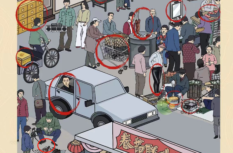 老六爱找茬露天集市怎么过?图中在八十年代的集市场景,有很多摊位和客人,非常热闹,大家要找到不符合年代的东西。下面为大家带来老六爱找茬露天集市过关攻略,一起来看看吧。