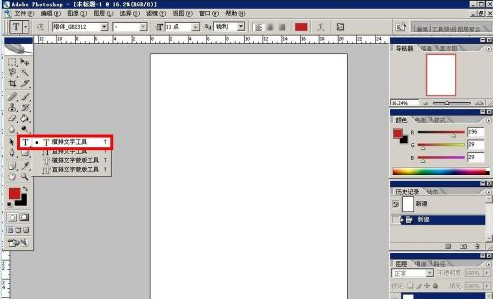 建立好画布之后,可以看到下图一个类似word的空白背景文件,我们选择左侧工具栏中的T字母工具,然后点击右下角箭头选择横排文字;